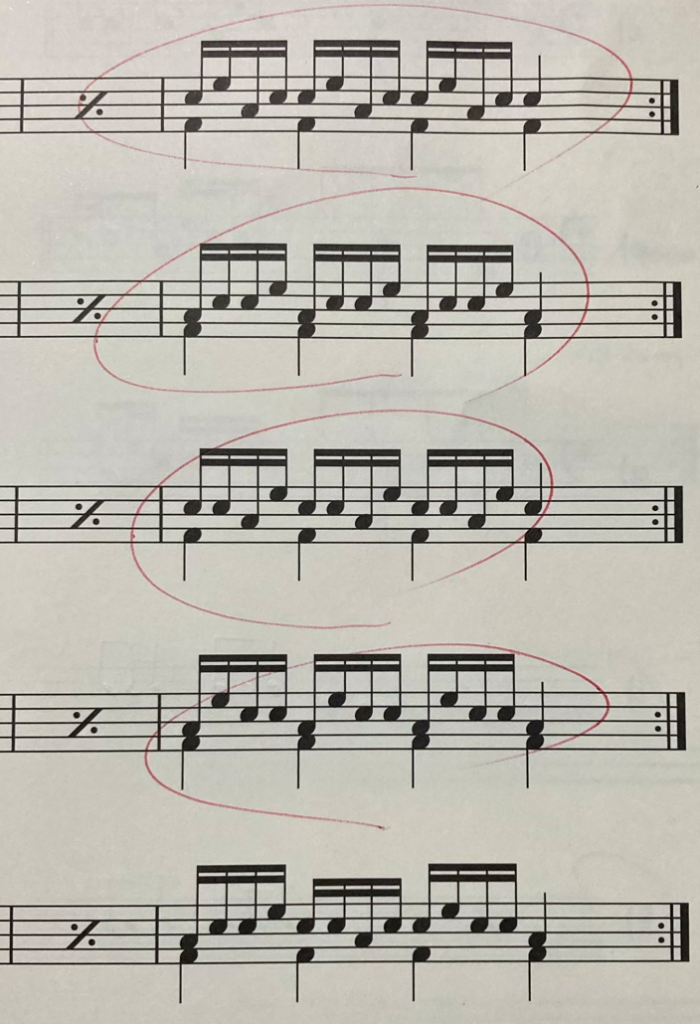 練習した夜は、寝る直前か夢の中かで練習したリズムがひたすらリピートされるのですが、なぜか起きている今は、頭の中でリズムが回っていません。なので、正確に表せているかわかりませんが・・・