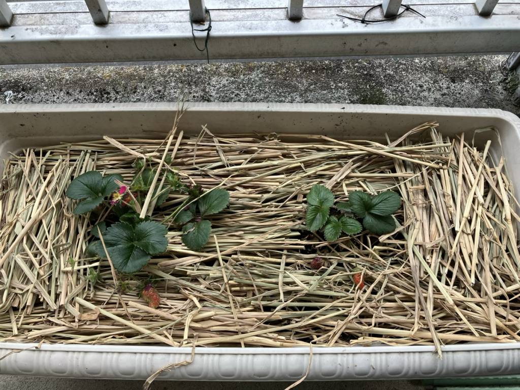 と今更ながら思いつつ、今ある苺を最大限に実らせるためにはと、調べてとりあえずプランターに藁を敷いてみました。