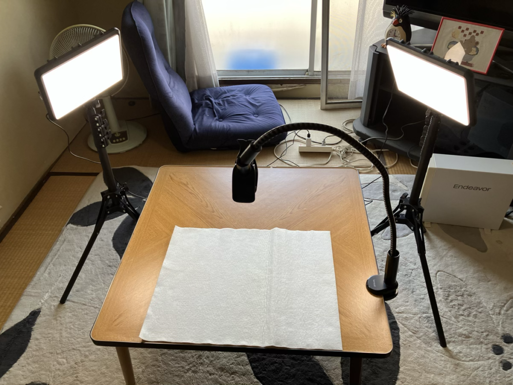 いままでは、しがないライトにティッシュペーパーを貼って、光を弱めたりして調整していたのですが、