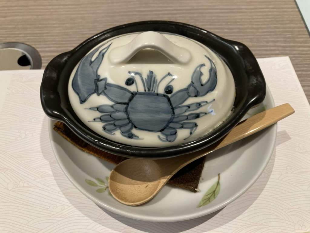 さて、料理はコース料理を選びました。蟹の釜めしとか、お刺身、天ぷらなどなど。