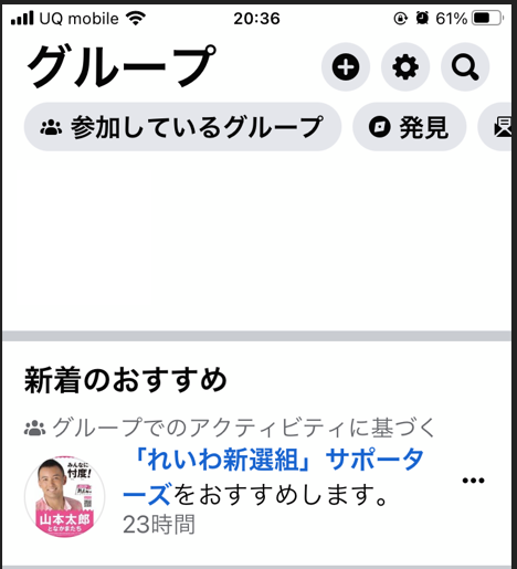「グループのアクティビティに基づく」とかなんとか書いてあるけれど、私はFacebookでは、一切、政治の話はしていませんし、「れいわ」と入力したことすらありません。