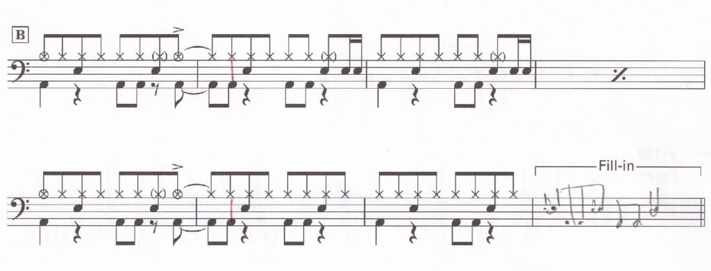 シンバルが伸びるところを「シンコペーション」というらしいのですが、そのシンコペーションのフットドラムの足の踏み込みをしっかりしましょうと先生からご指摘をいただきまして、そこばかり何回もやりました。