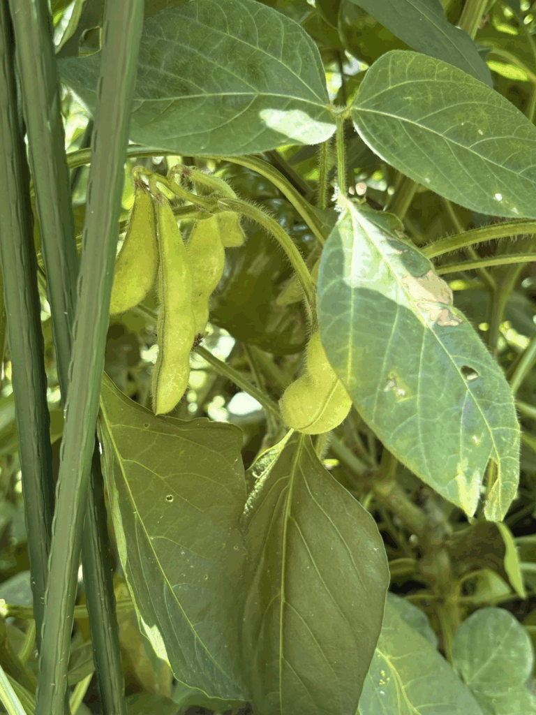 青々としたトマトや枝豆、ピーマンにナスビが実をつけていました。
