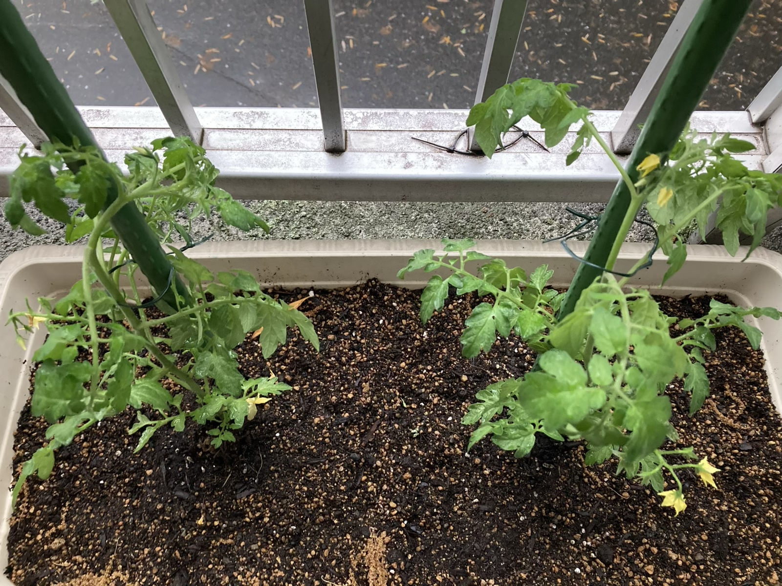 日常生活今日は、雨も降りましたが、強風もあり、プチトマトが倒れてしまいました。