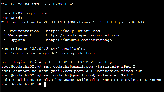 昨日からできないTailscaleをつかったSSH接続ですが、ググってもググっても回答見当たらずでした。(今日のところは。。。)