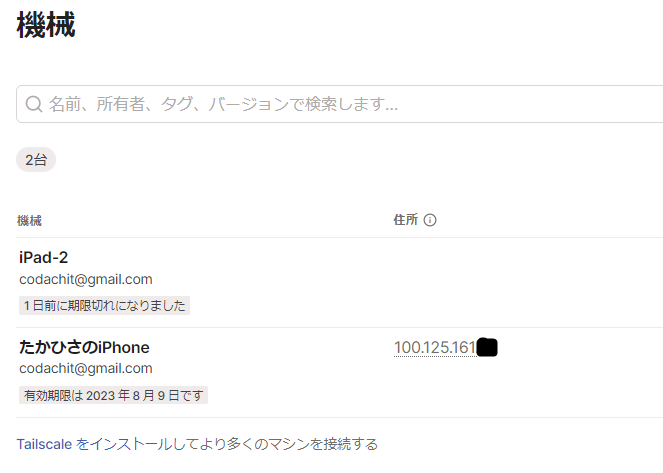 ちなみに、Tailscaleのマシーン登録画面はこれで、